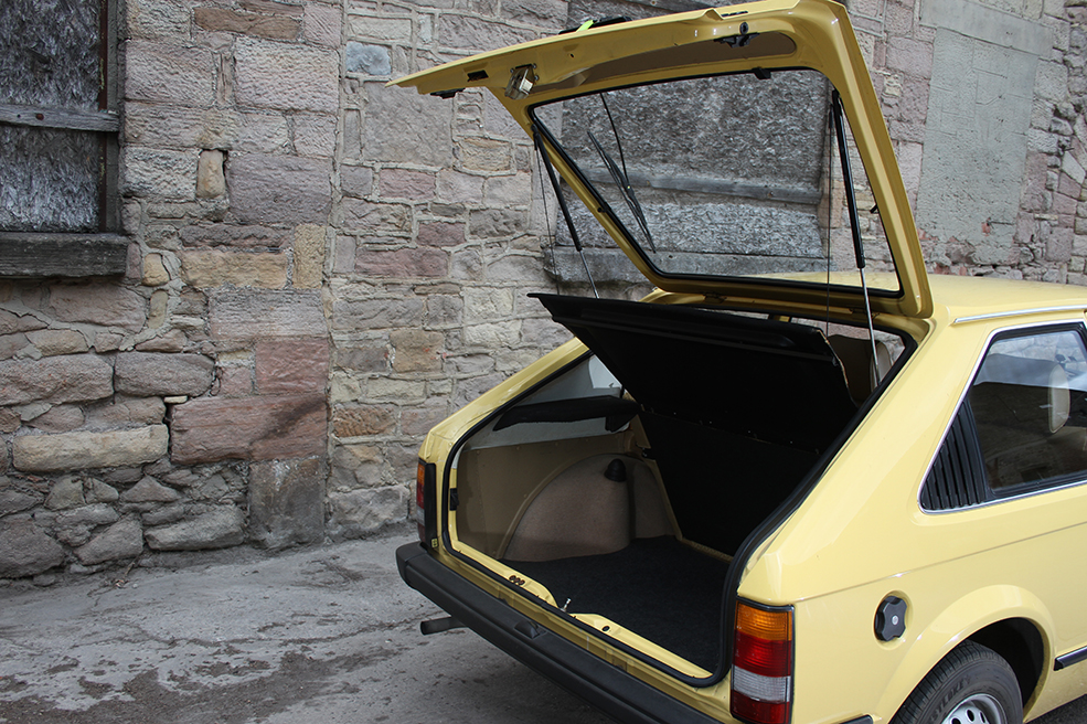 On the driver’s side, this is 1980s motoring, economy style. Well, maybe not total economy, perhaps more like 1980s motoring on a real-world budget. The dash slopes down and away from you, but not as dramatically as it does on something like the early Mk3 Cortinas. You’ve got a large square section in the middle that has the air vents, ash tray, fog lights, hazards, radio and heater sliders. There is a space that I would guess was filled by a clock on the more expensive versions, and a little cubby ahead of the gearstick. Dead ahead of the driver and once again sloping down at the bottom you have a rectangular binnacle containing fuel and temperature on the left, speedo in the middle (up to 120mph and currently reading 46,893 miles), and then to the right a little cluster of warning lights for ignition, oil, handbrake, main beam and direction indicators. Further down to the right is the light switch – turn for side lights and dip as you would expect, but you can also pull it out to switch on the interior light. The stalks are big and chunky, indicators on the left and wipers on the right.